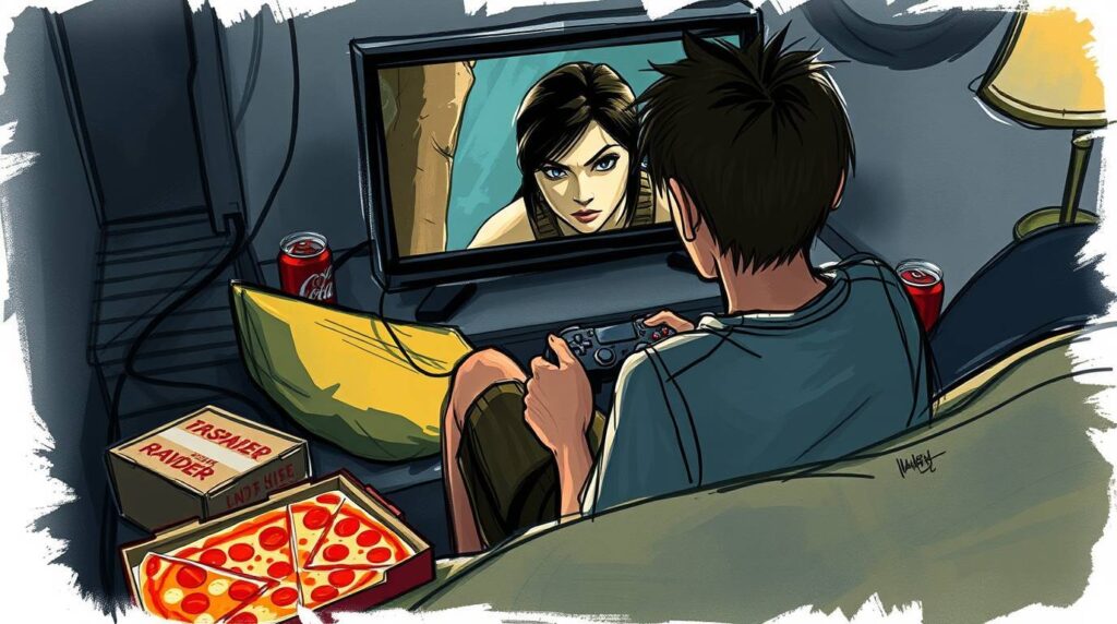 Lara lowers one pistol. Something in the air hums—faintly electrical. She looks around, confused. Then, slowly, she looks up. Directly into the player’s view.